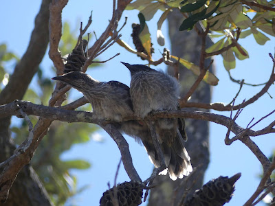 A brief comment is warranted for these next two images. I had heard the noisy squawking of young birds nearby. Without too much difficulty the sound was traced to this pair of young little wattlebirds - they look so cute in a couple of different poses and clearly their proximity was a comfort to eachother!